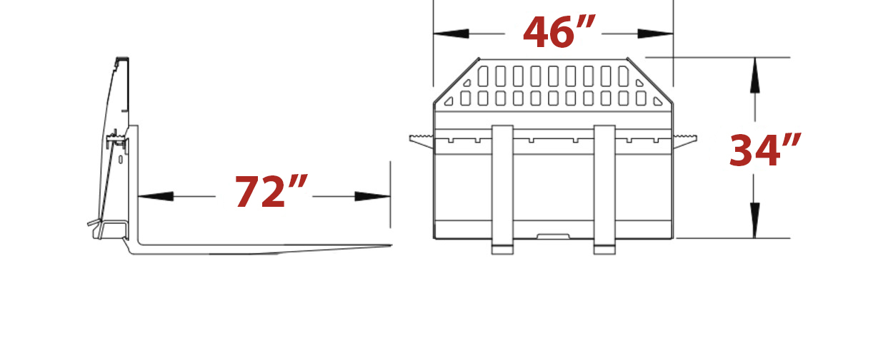 Our Industrial Series Hydraulic Pallet Forks are 72" long Class III are 1 3/4 inches thick, 5 inches wide, completely hydraulic adjustable, heat treated, and made in America. These forks permit the operator to variably adjust the width of the tines without having to exit the operators cab. This frame comes standard equipped with two side steps to make it easy for you to climb in and out of your machine. The frame is constructed from 3” channel and 2” x 3” angle that is 3/8” thick. The forks are rated at 8000 lbs. Other size forks with higher ratings available. Our frames are powder coat painted for a long lasting finish. These forks include the frame, fork tines and hydraulic hoses with flat face couplers.